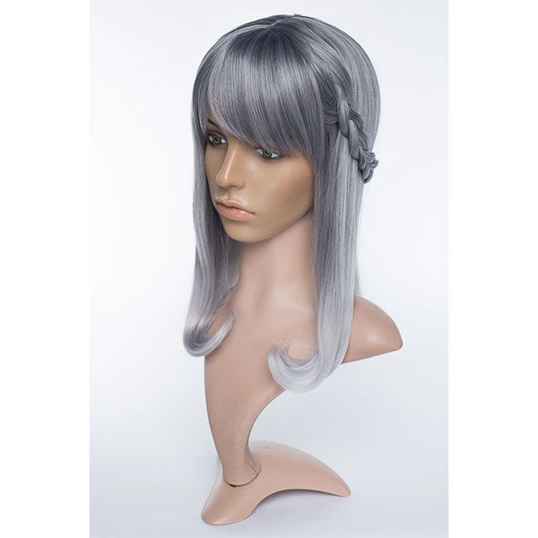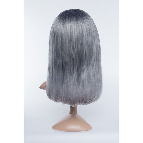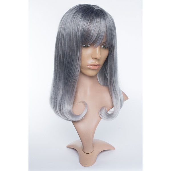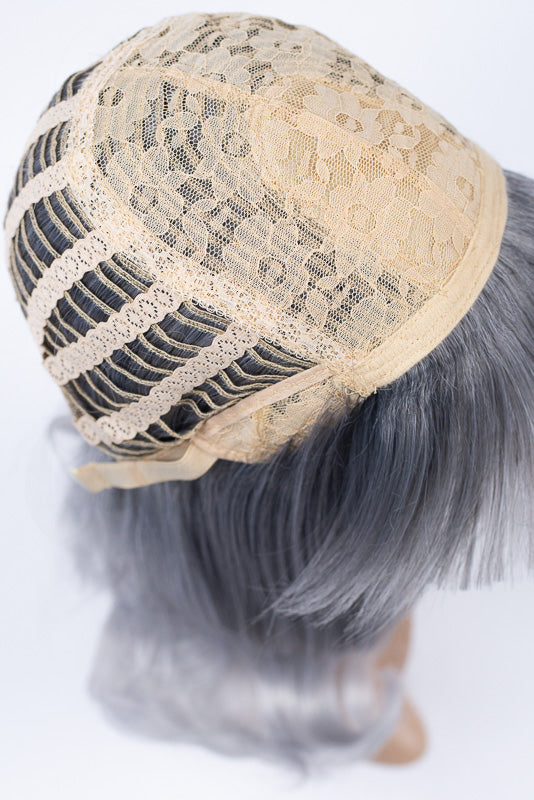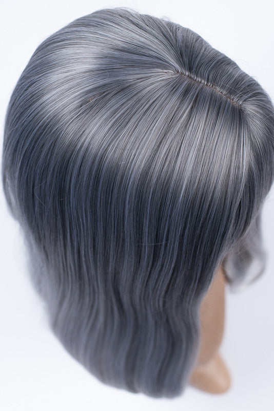 Elinor's stylish silvery grey locks measure approximately 16.5" (42 cm) from the back of her center part or 19" (48 cm) when pulled straight. The bangs measure 5.5" (14 cm) beginning of the part or 4.5" (11 cm) from the front of the hairline.