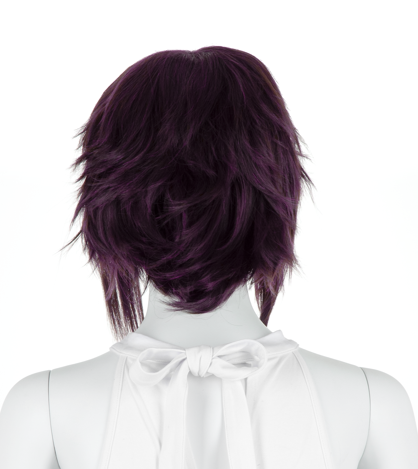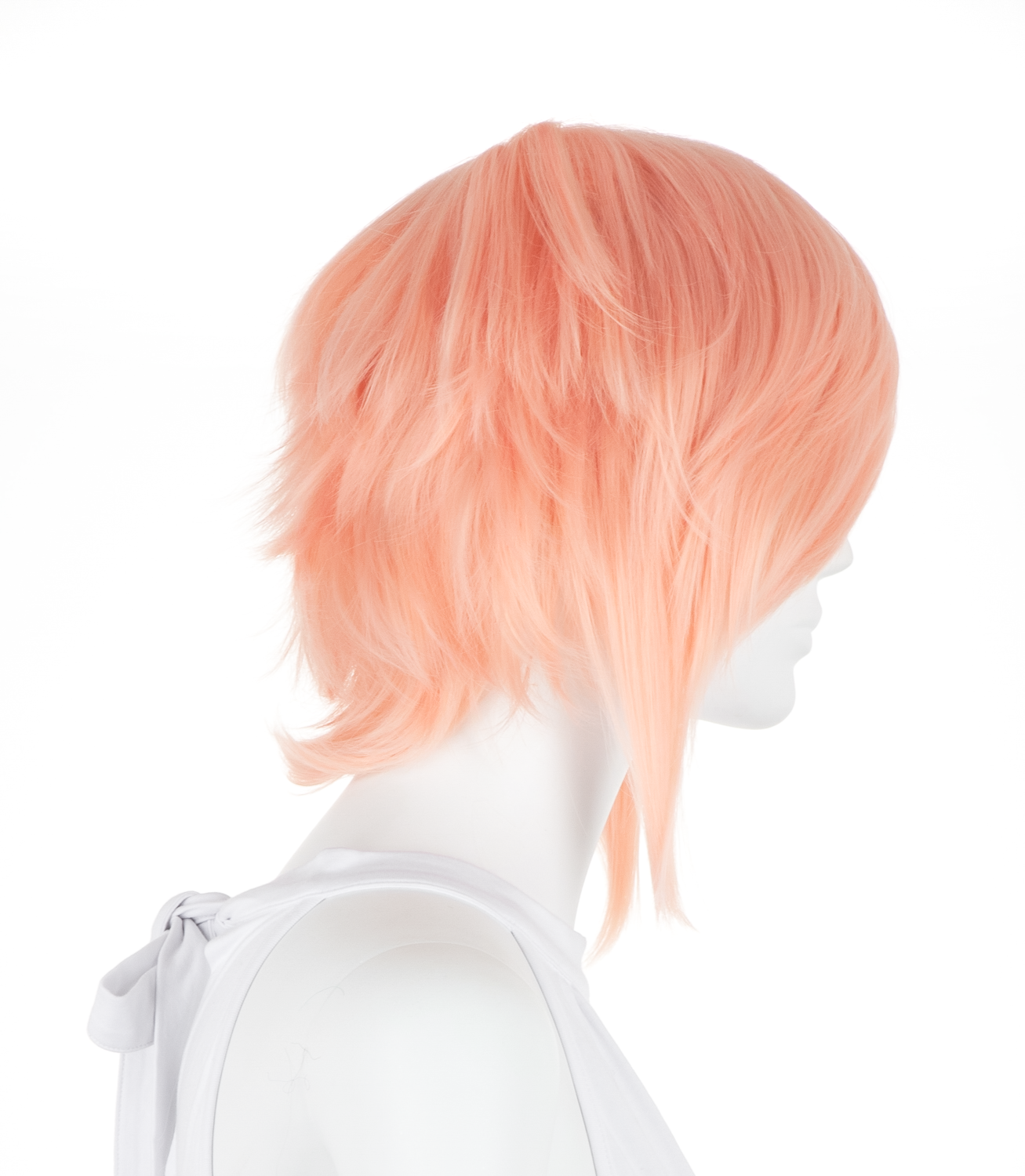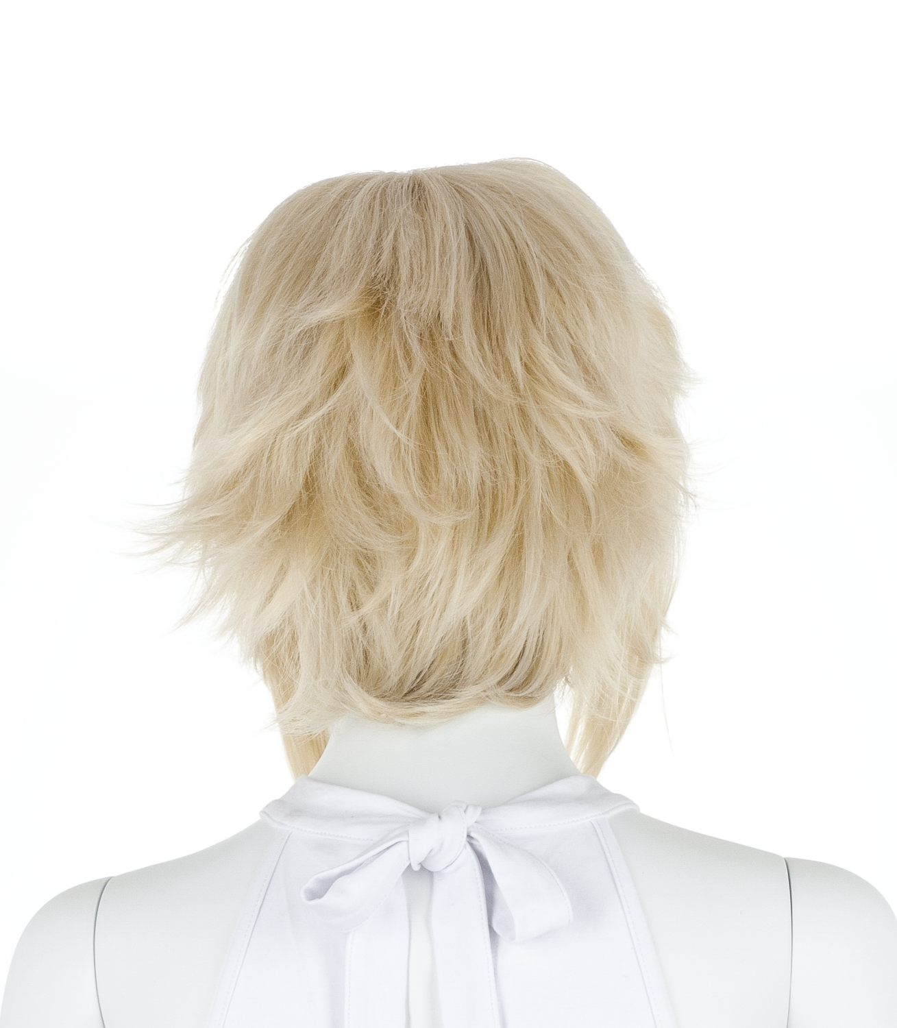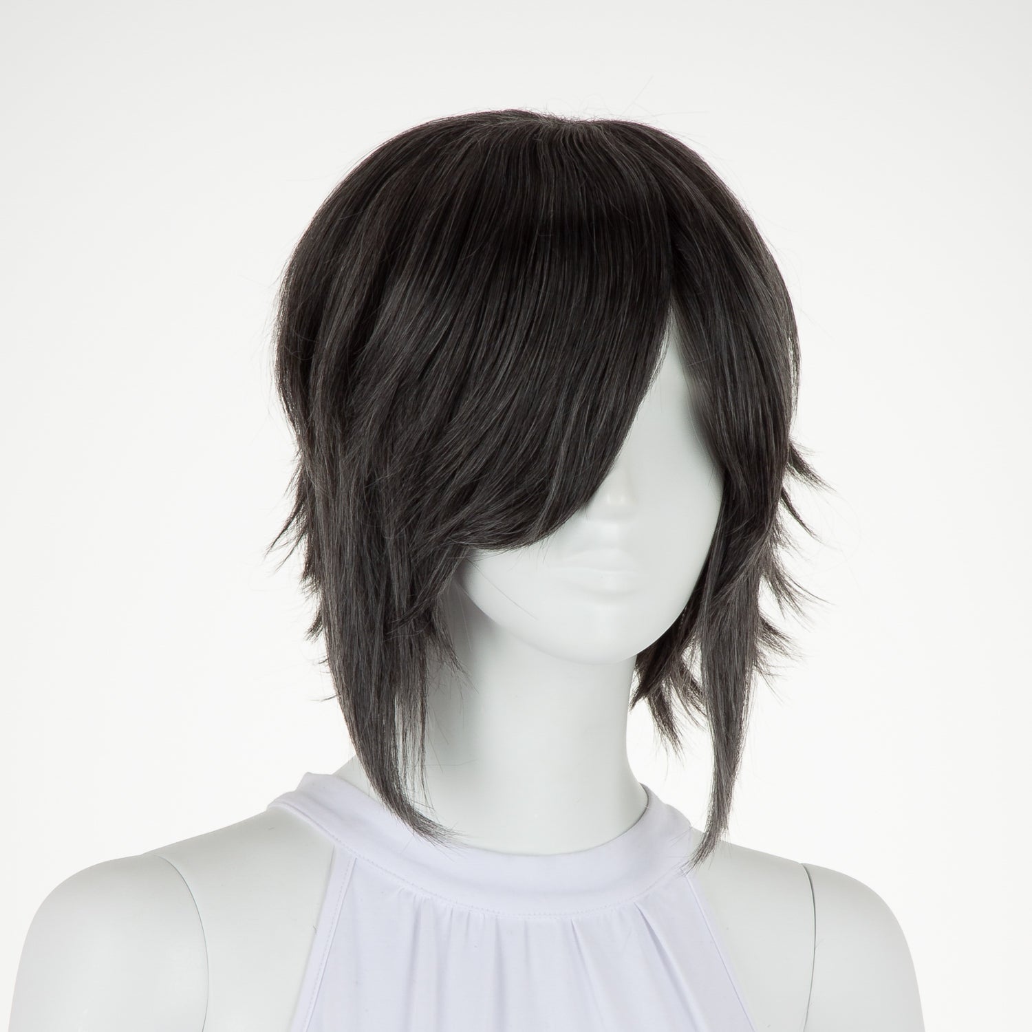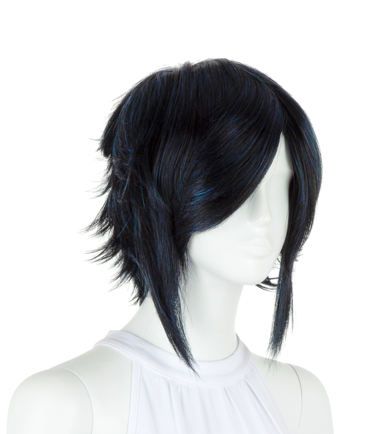 This wig has short, choppy layers in the back with long side sections at the ears. The bangs are long and reach just around the nose on a person. Jaguar's overall length measures 5'' to 6'' (13 cm to 15 cm). This wig has a crimped top - thick and great for spiking, teasing, fluffing, or leaving as-is.