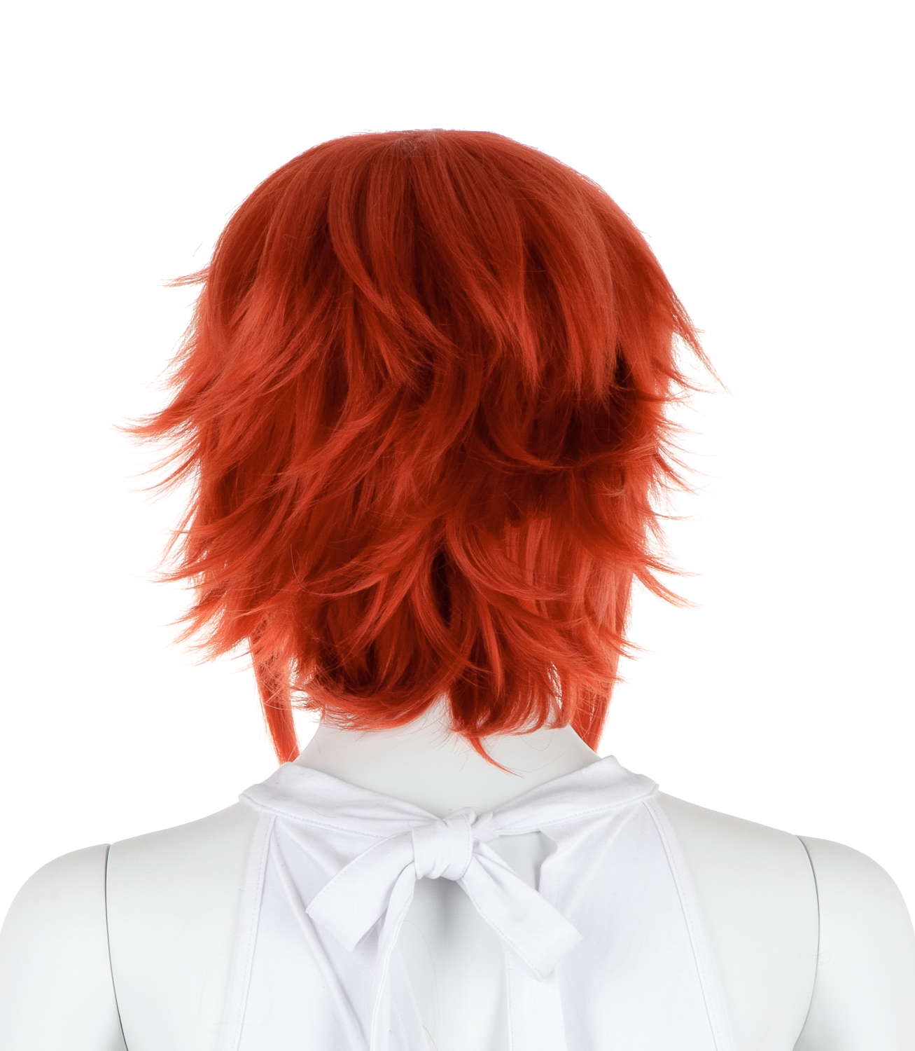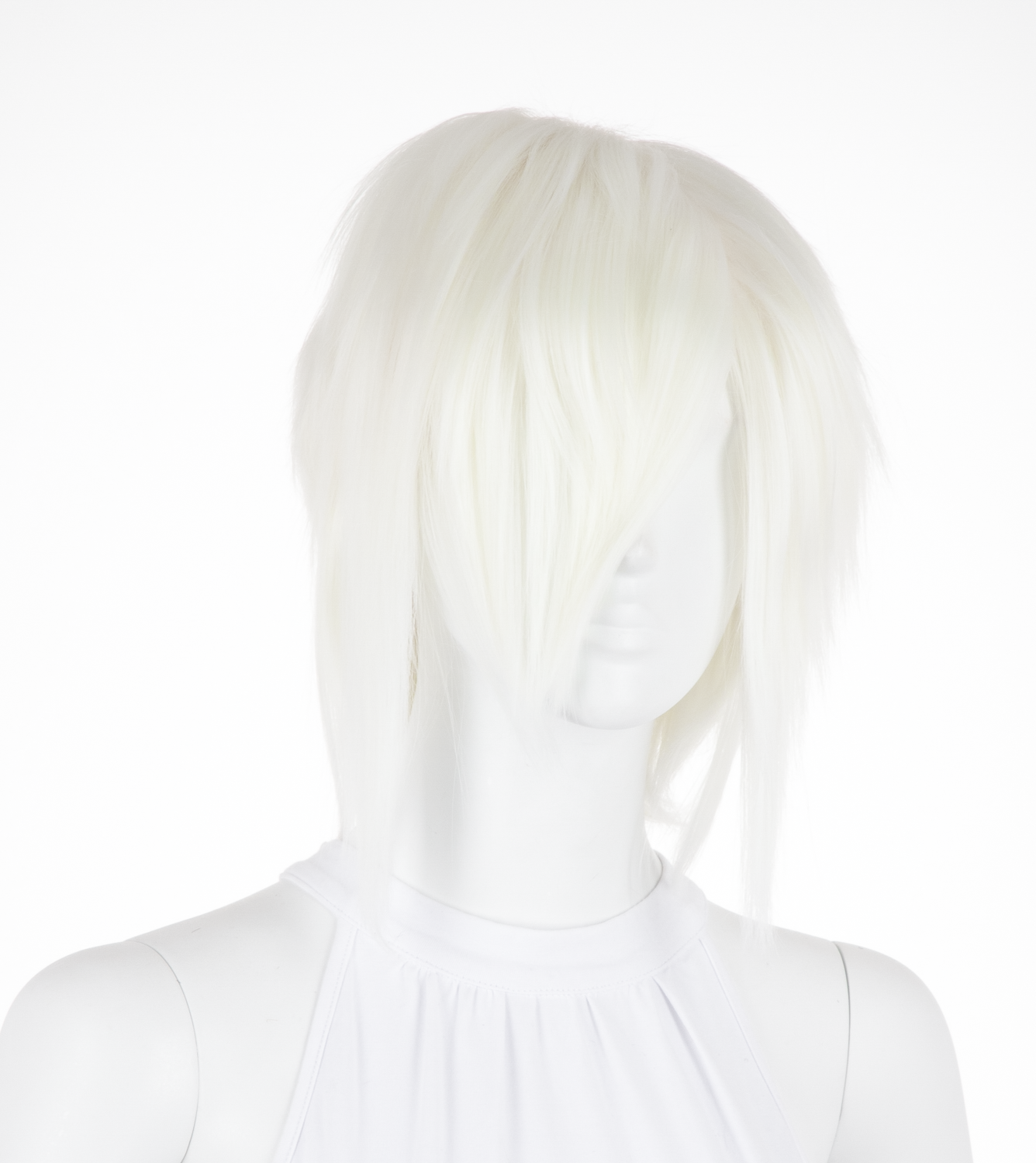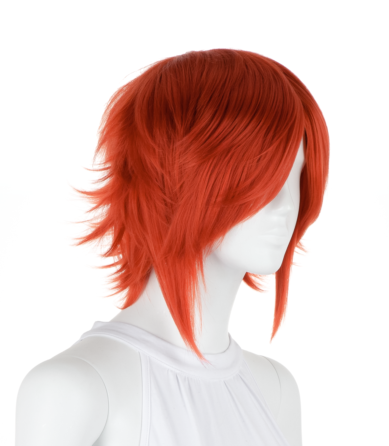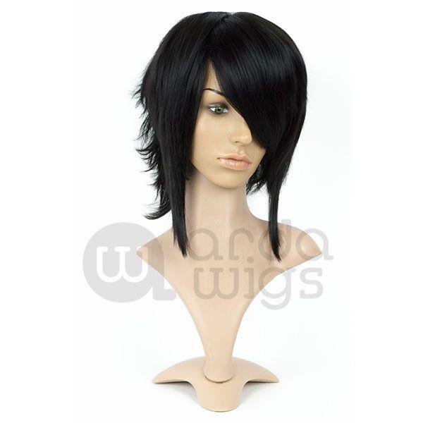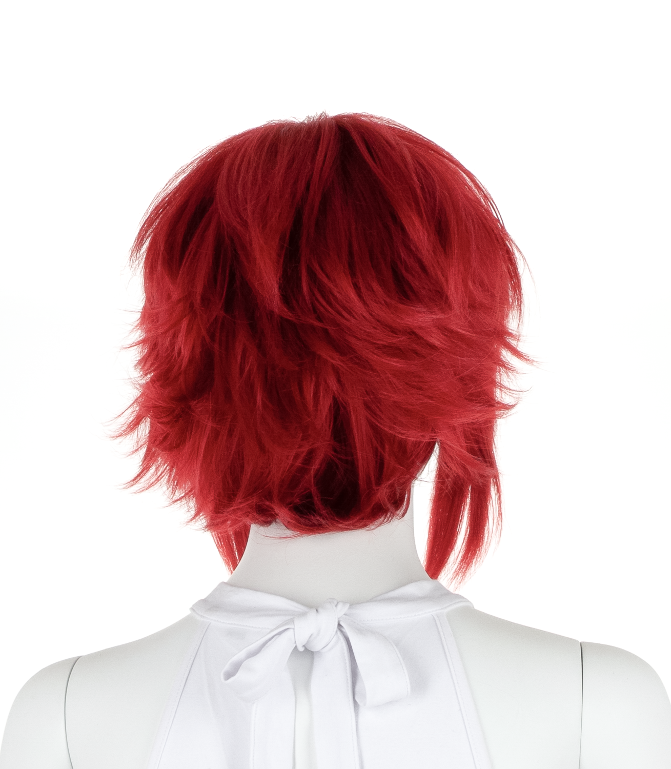 This wig has short, choppy layers in the back with long side sections at the ears. The bangs are long and reach just around the nose on a person. Jaguar's overall length measures 5'' to 6'' (13 cm to 15 cm). This wig has a crimped top - thick and great for spiking, teasing, fluffing, or leaving as-is.