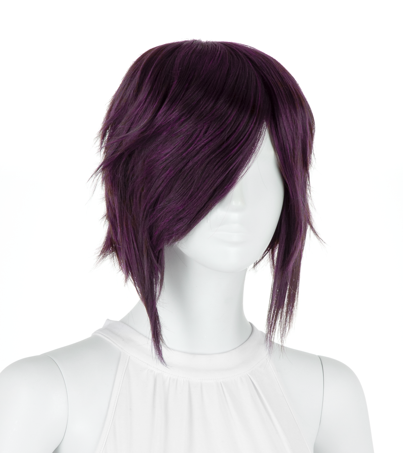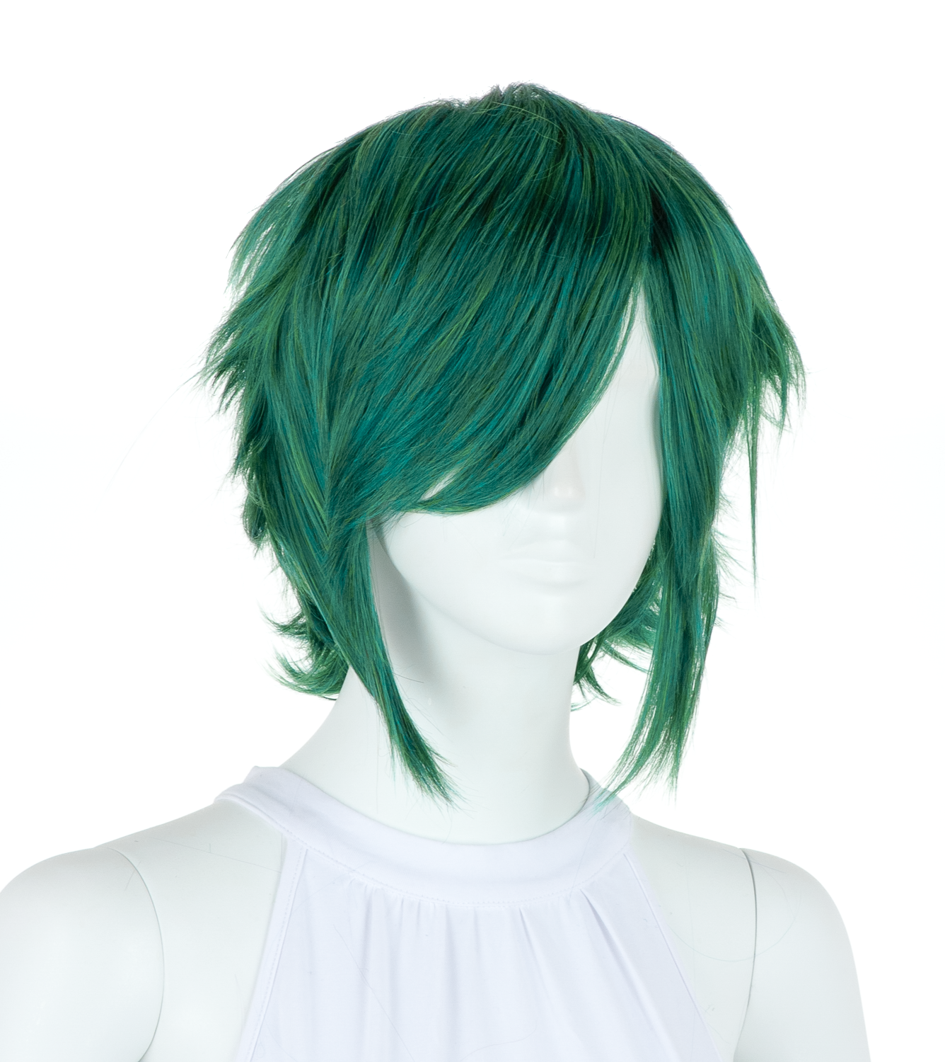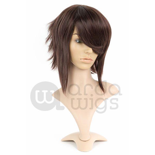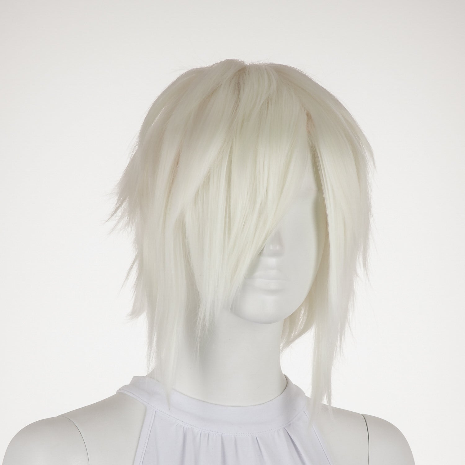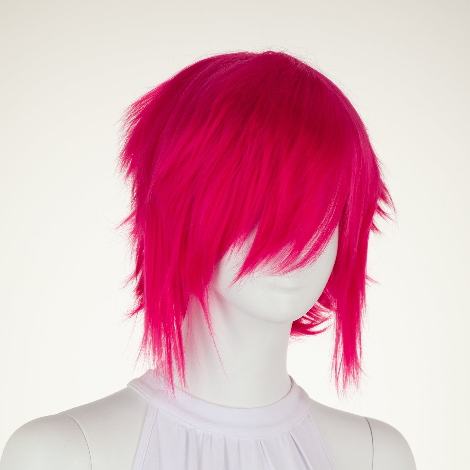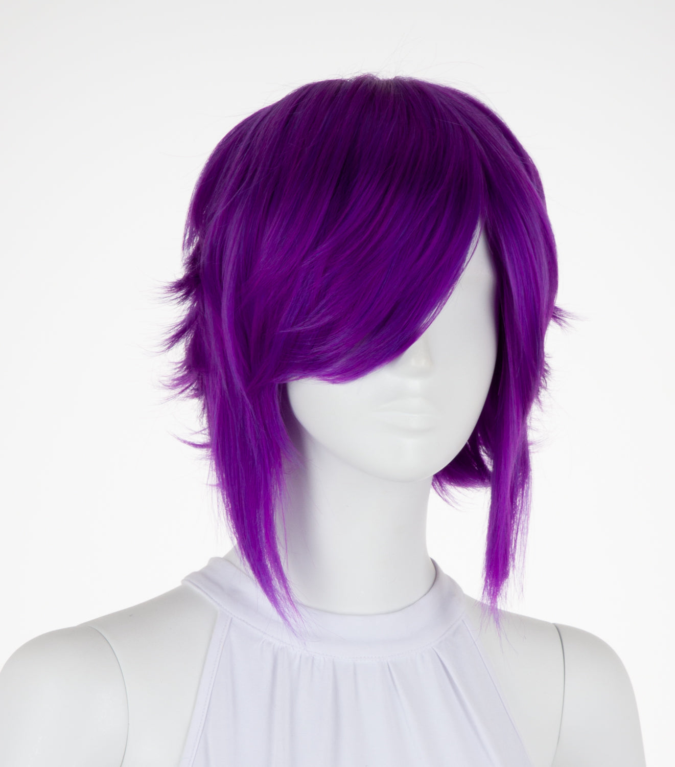 This wig has short, choppy layers in the back with long side sections at the ears. The bangs are long and reach just around the nose on a person. Jaguar's overall length measures 5'' to 6'' (13 cm to 15 cm). This wig has a crimped top - thick and great for spiking, teasing, fluffing, or leaving as-is.