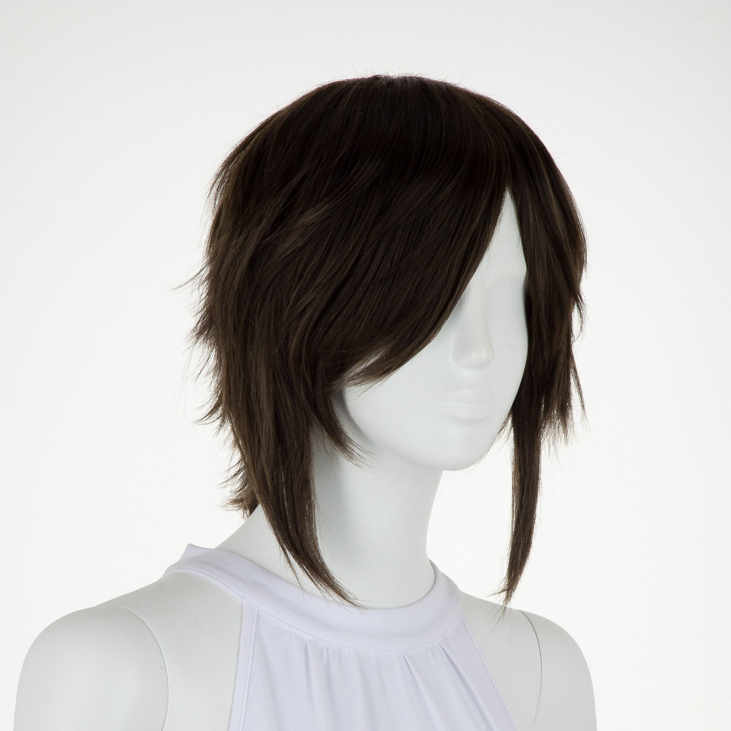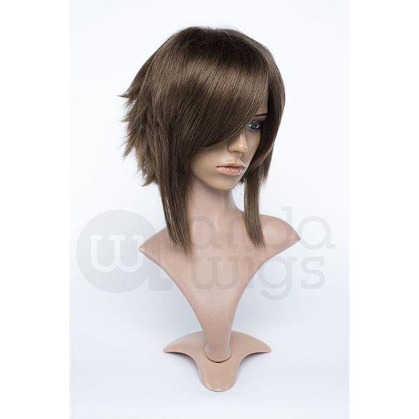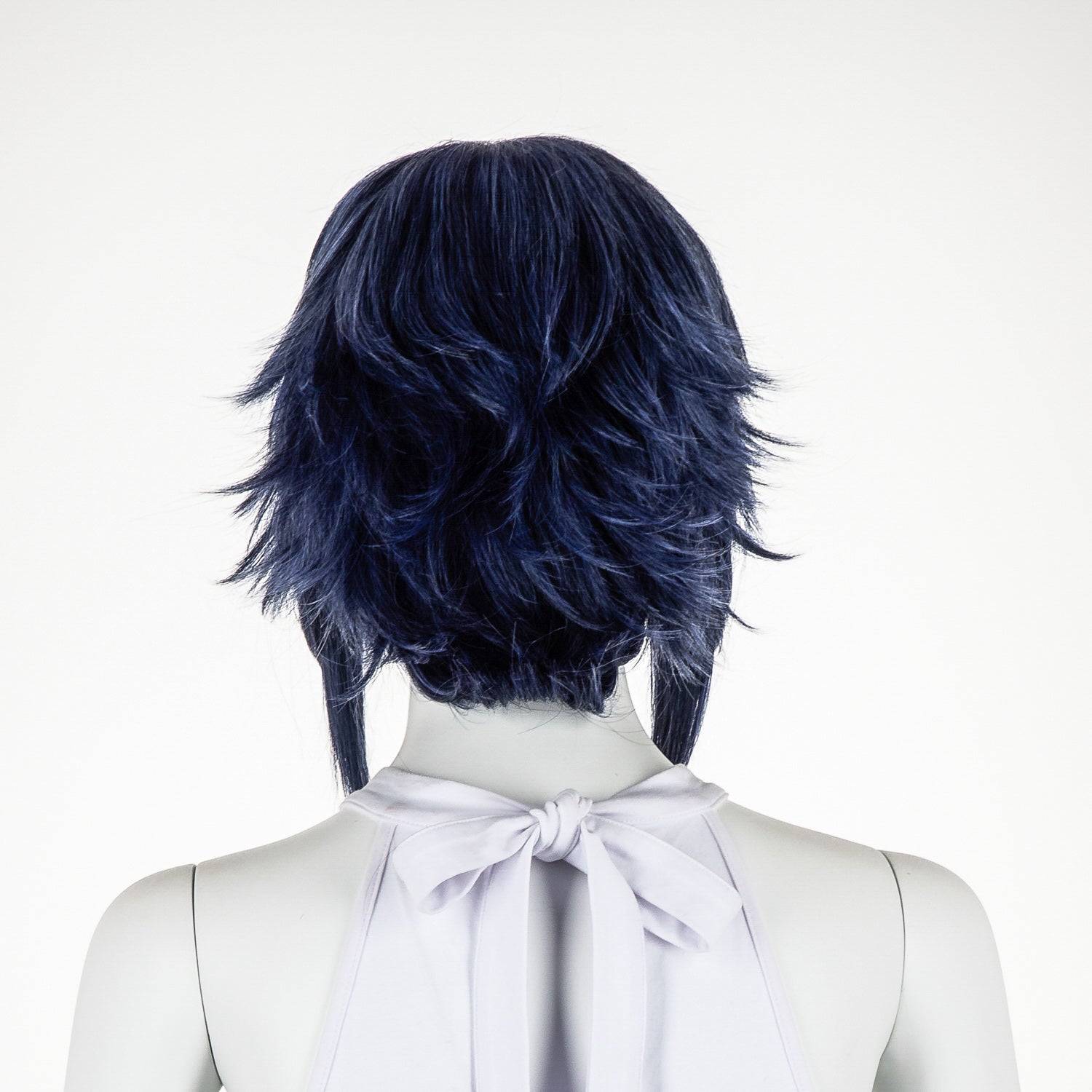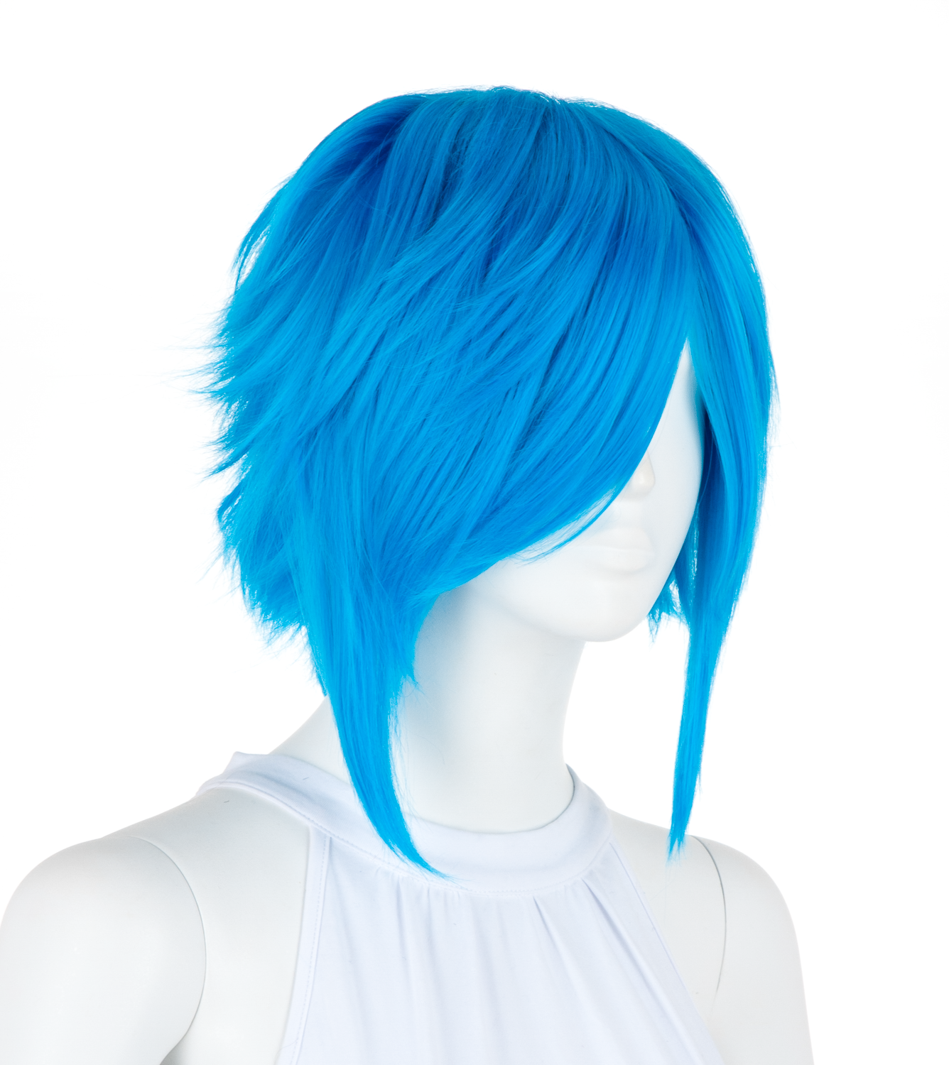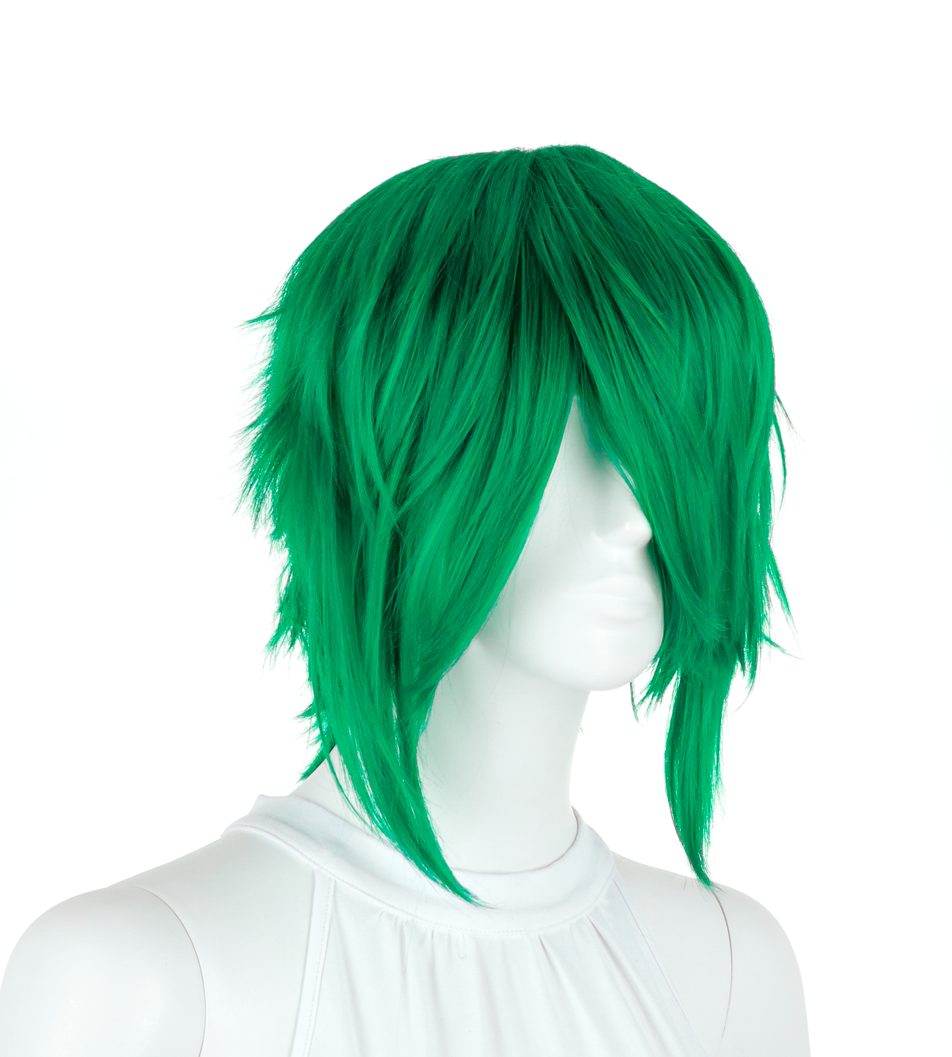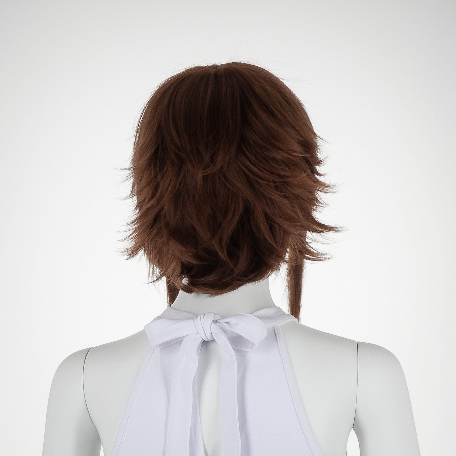 This wig has short, choppy layers in the back with long side sections at the ears. The bangs are long and reach just around the nose on a person. Jaguar's overall length measures 5'' to 6'' (13 cm to 15 cm). This wig has a crimped top - thick and great for spiking, teasing, fluffing, or leaving as-is.