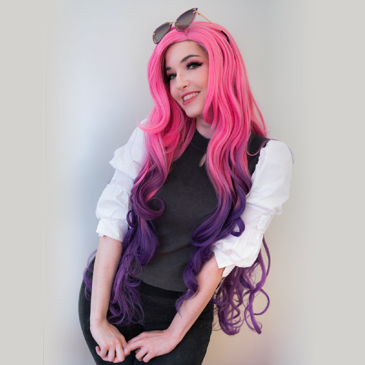 La: A note, or vocal bridge, to follow So. Our La is custom dyed Silky fiber from pink to purple and long, thick, relaxed curls allow this wig to be worn a variety of ways. Long bangs and a skin top side part provide a sexy, tousled look worthy of a popstar. Floating stage not included.