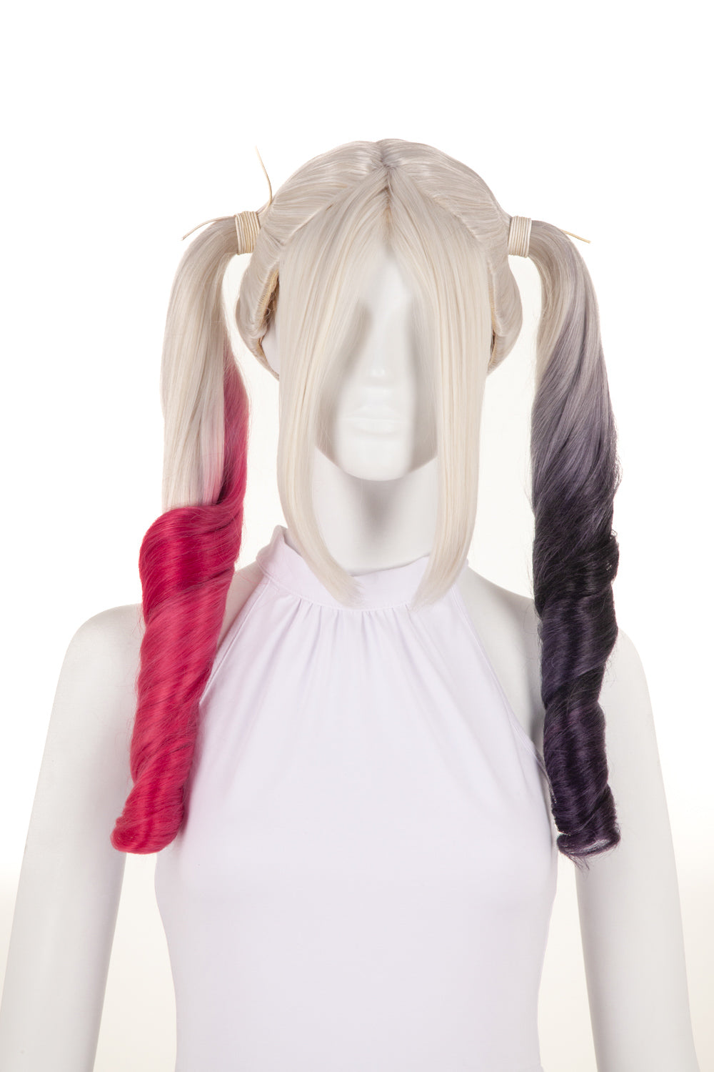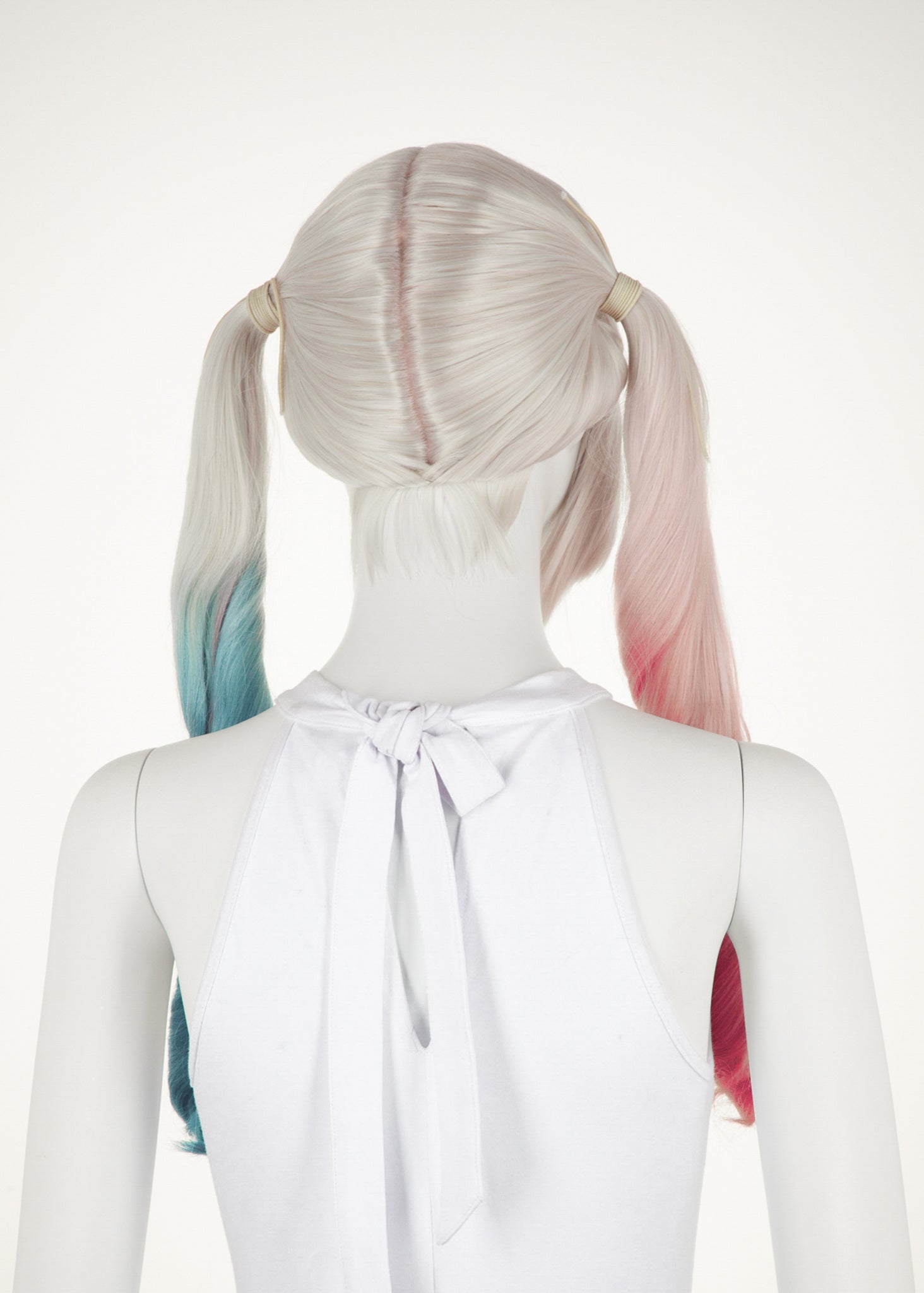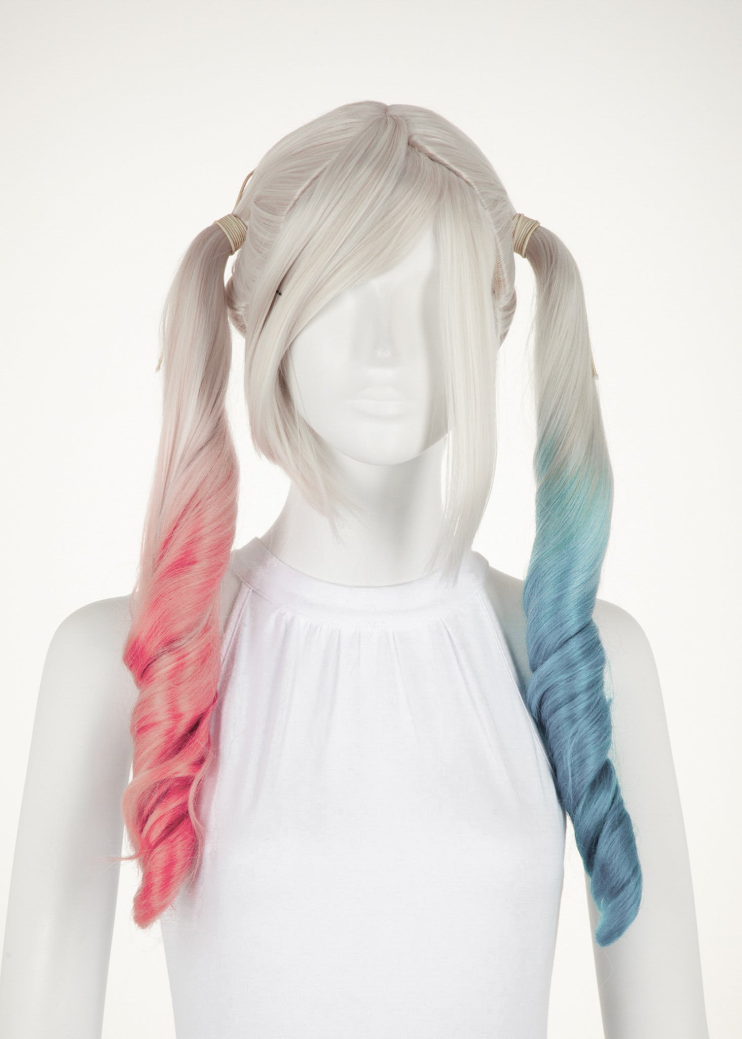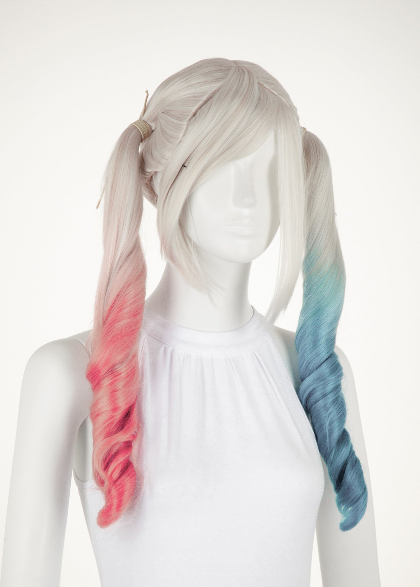 Everyone has a crazy side only the right wig can bring out. Our Quinn is made with two long, pre-styled ponytails in Apple Red (CL-004) and Black (CL-078) or dip dyed colors similar to Hot Pink (CL-007)/Teal (CL-043) or Apple Red (CL-004)/Black (CL-078). Dip dyed variants have a Frost Blonde (CL-054A) root color. They have a soft, natural curl. This wig also features a middle skin part from the crown to the base of the neck, neck fringe, and chin length bangs framing the face. So, puddin, wanna get crazy? The best people are.