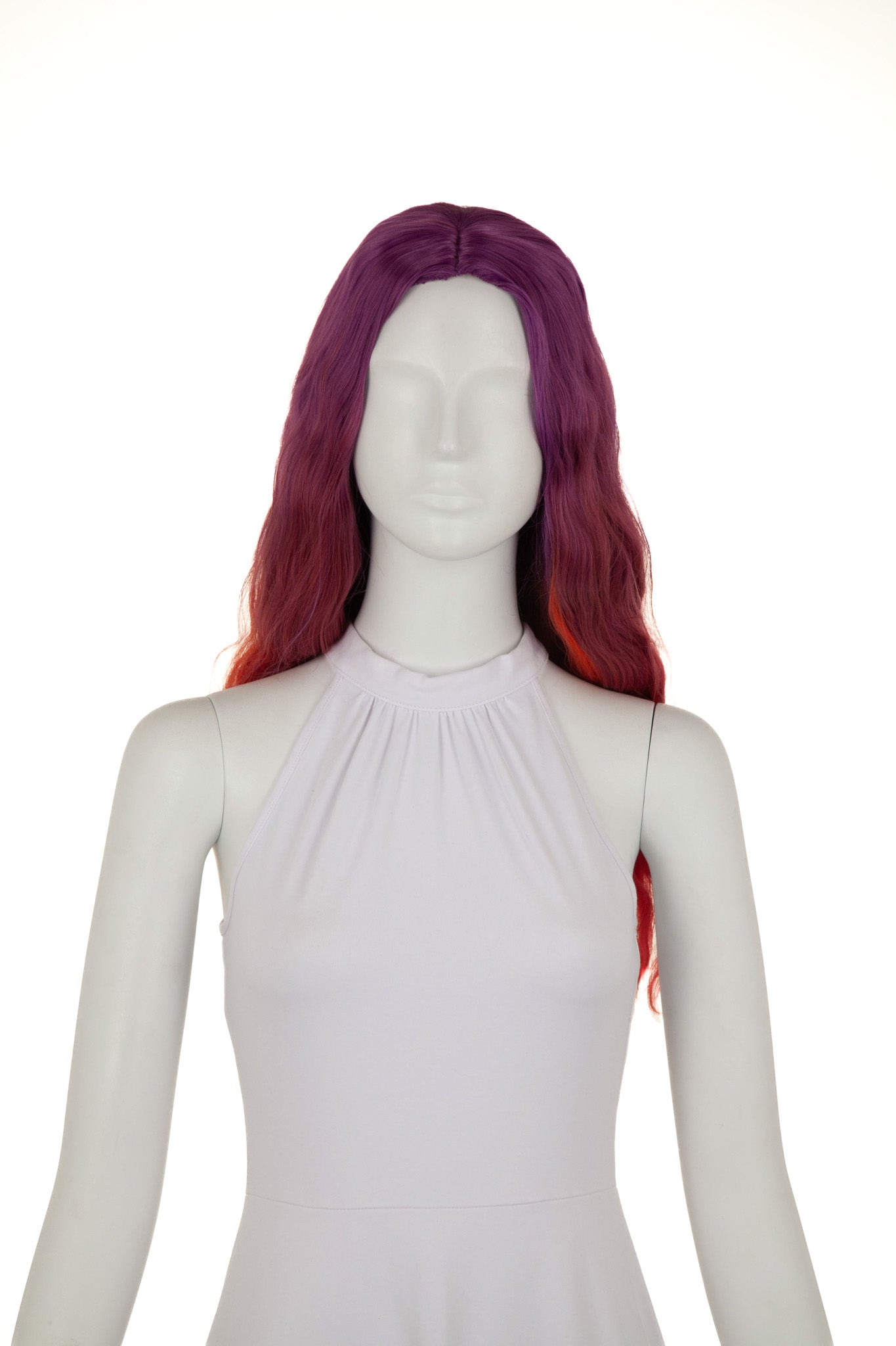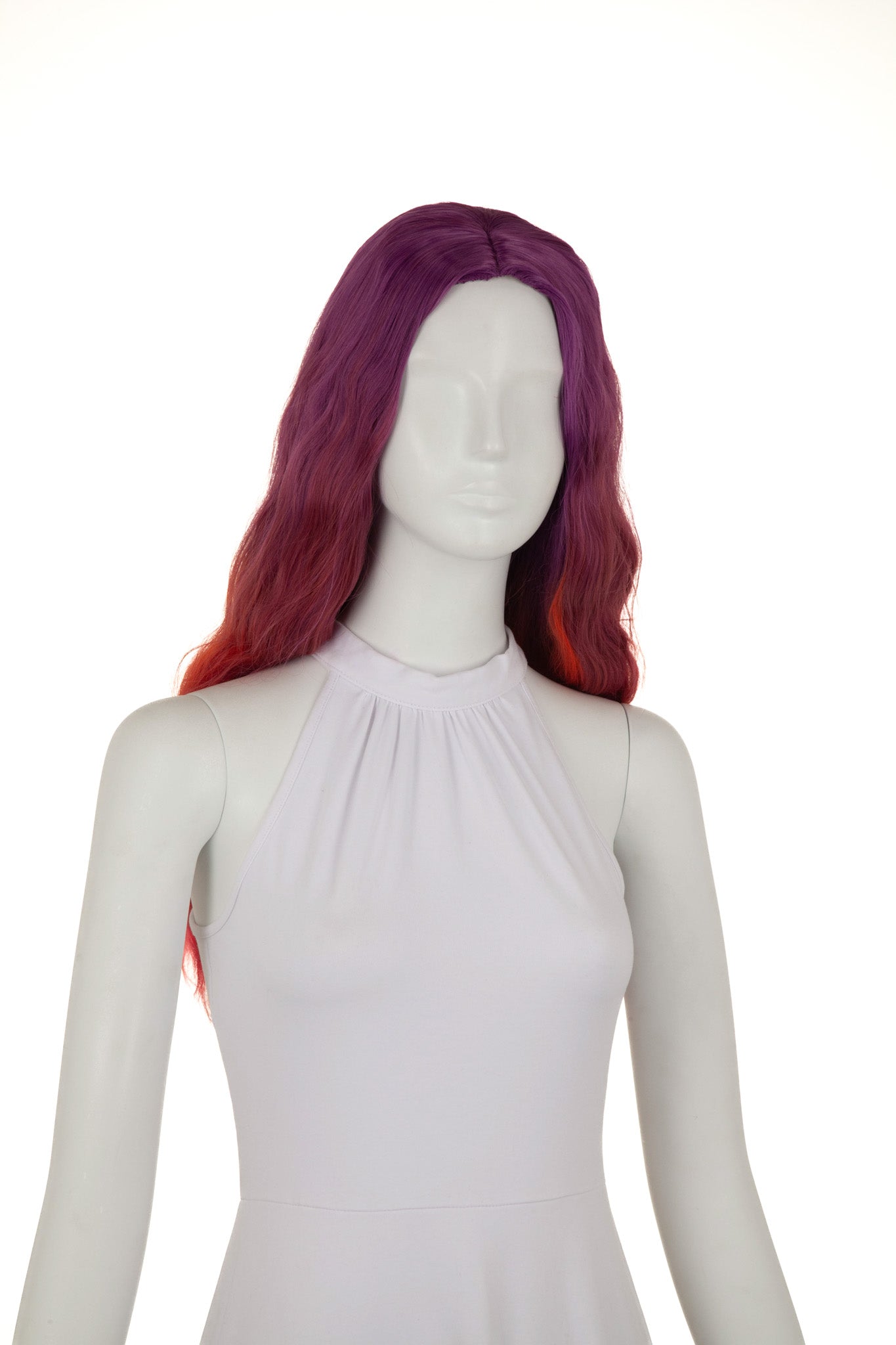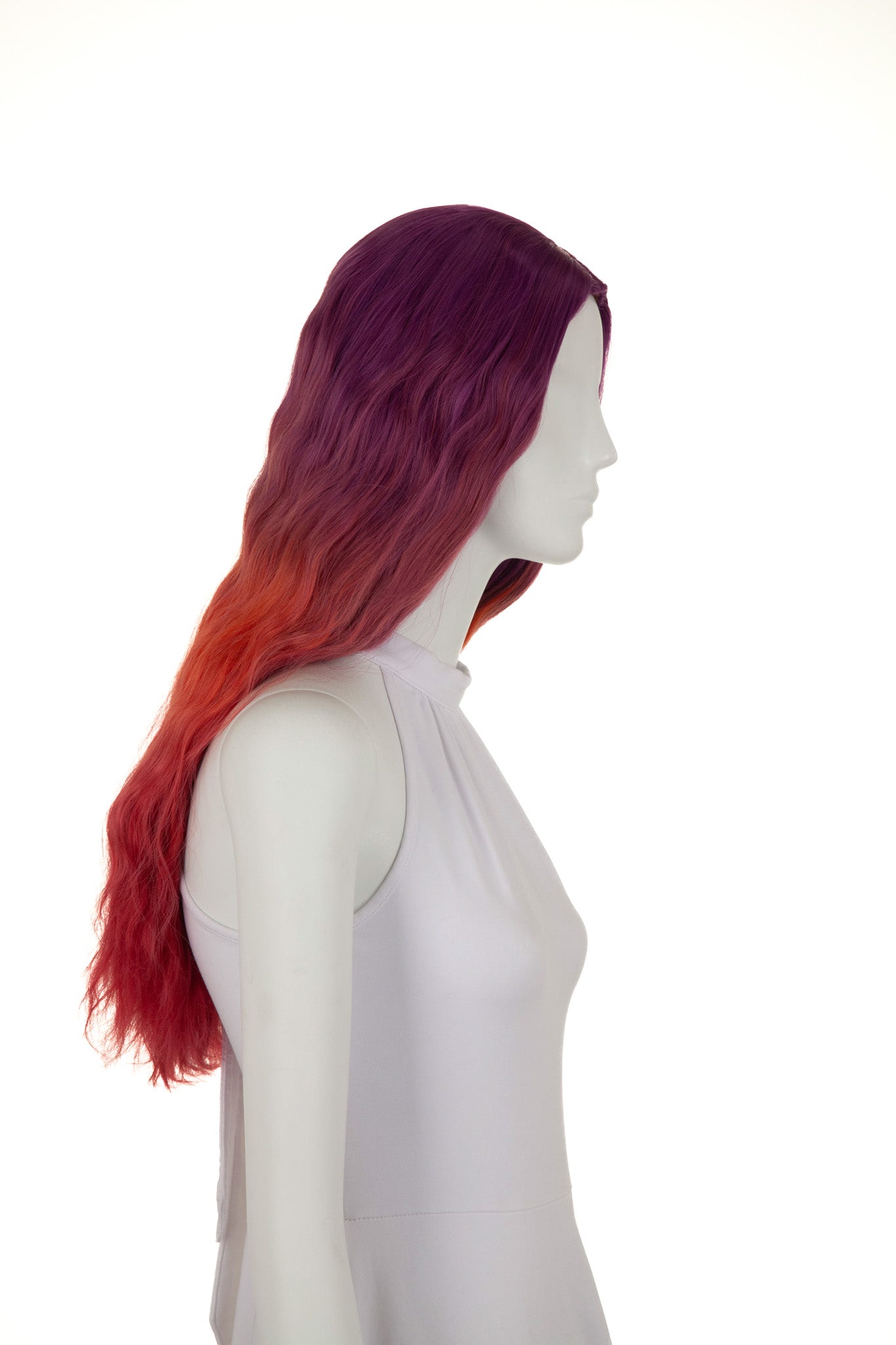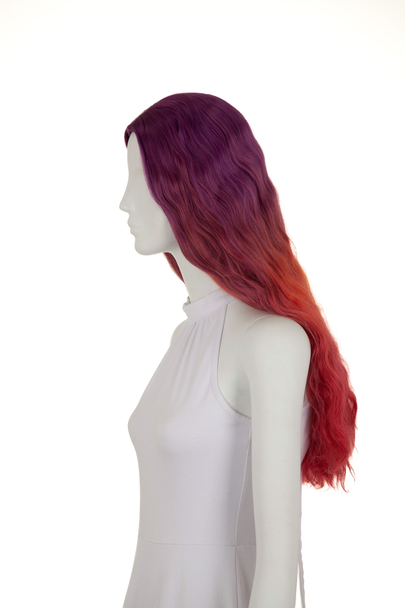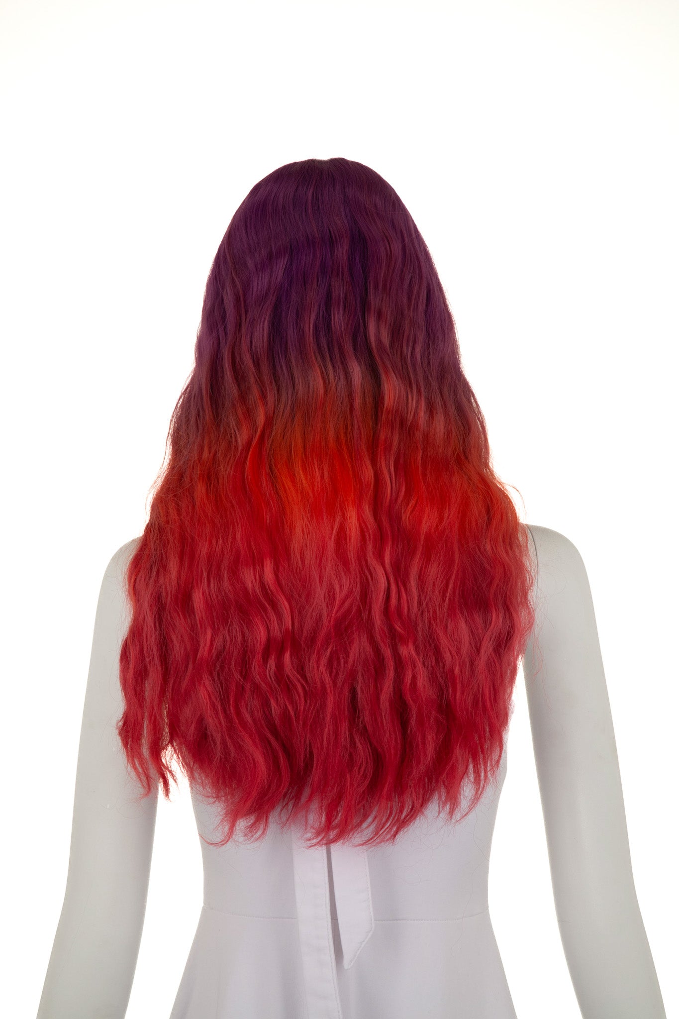 This stylish Ombre comes in our Silky fibers and starts in a warm purple which works its way to a summer orange, and eventually turns to a vibrant magenta towards the ends. The front two sides of the wig measures approximately 22" (55.5cm) long. The back and sides of the wig measures approximately 25" (63.5cm) long from the crown.