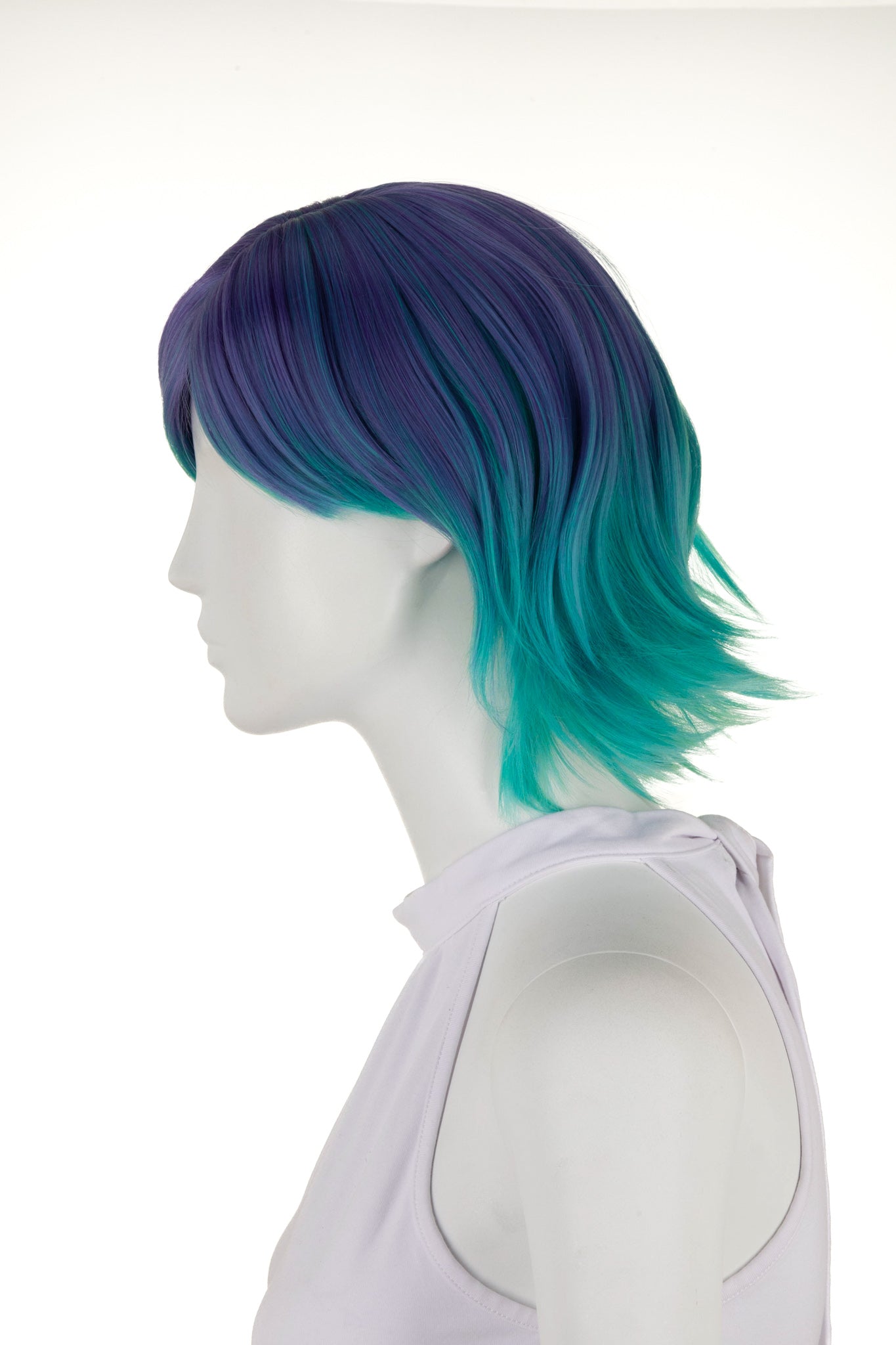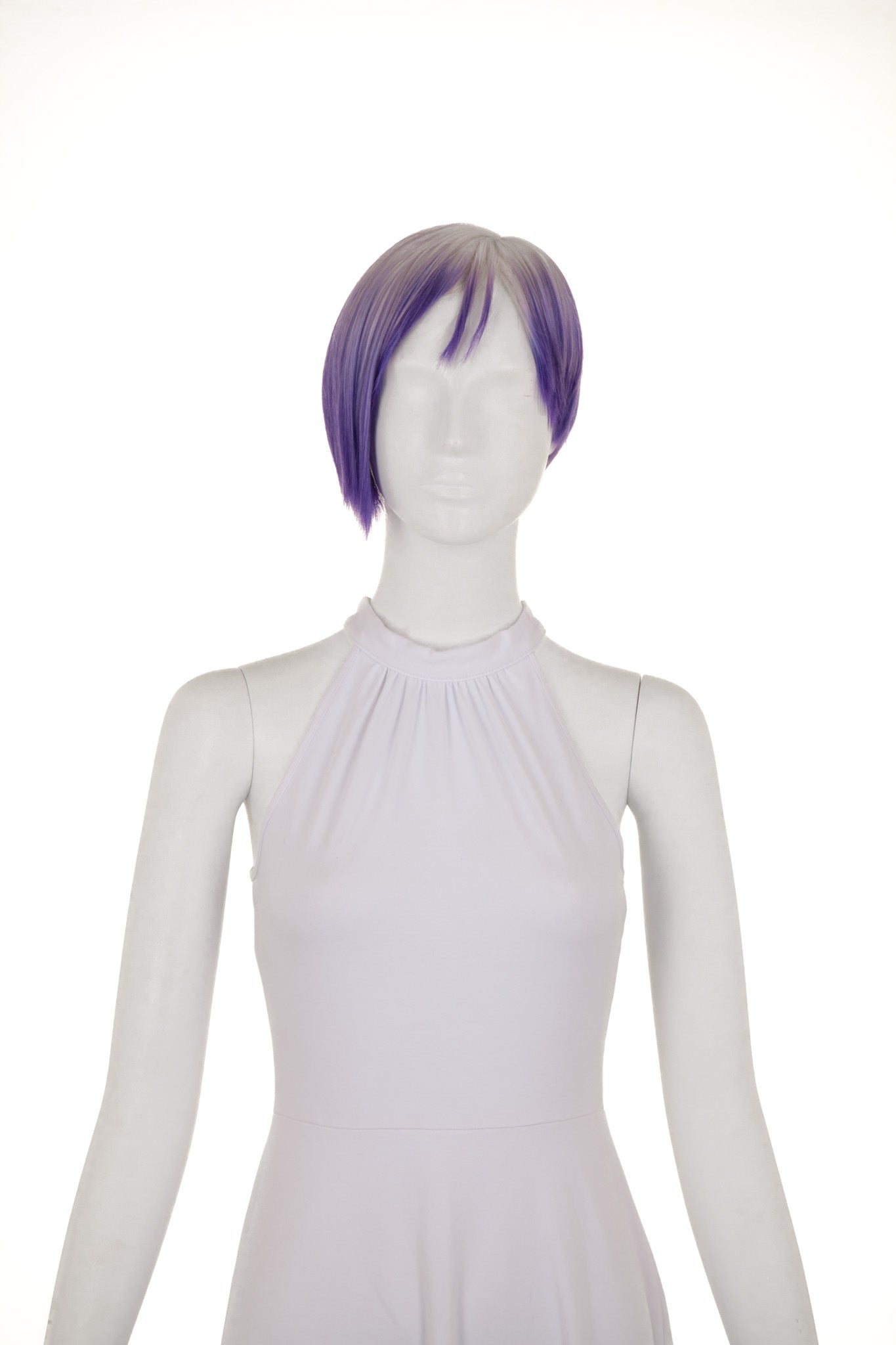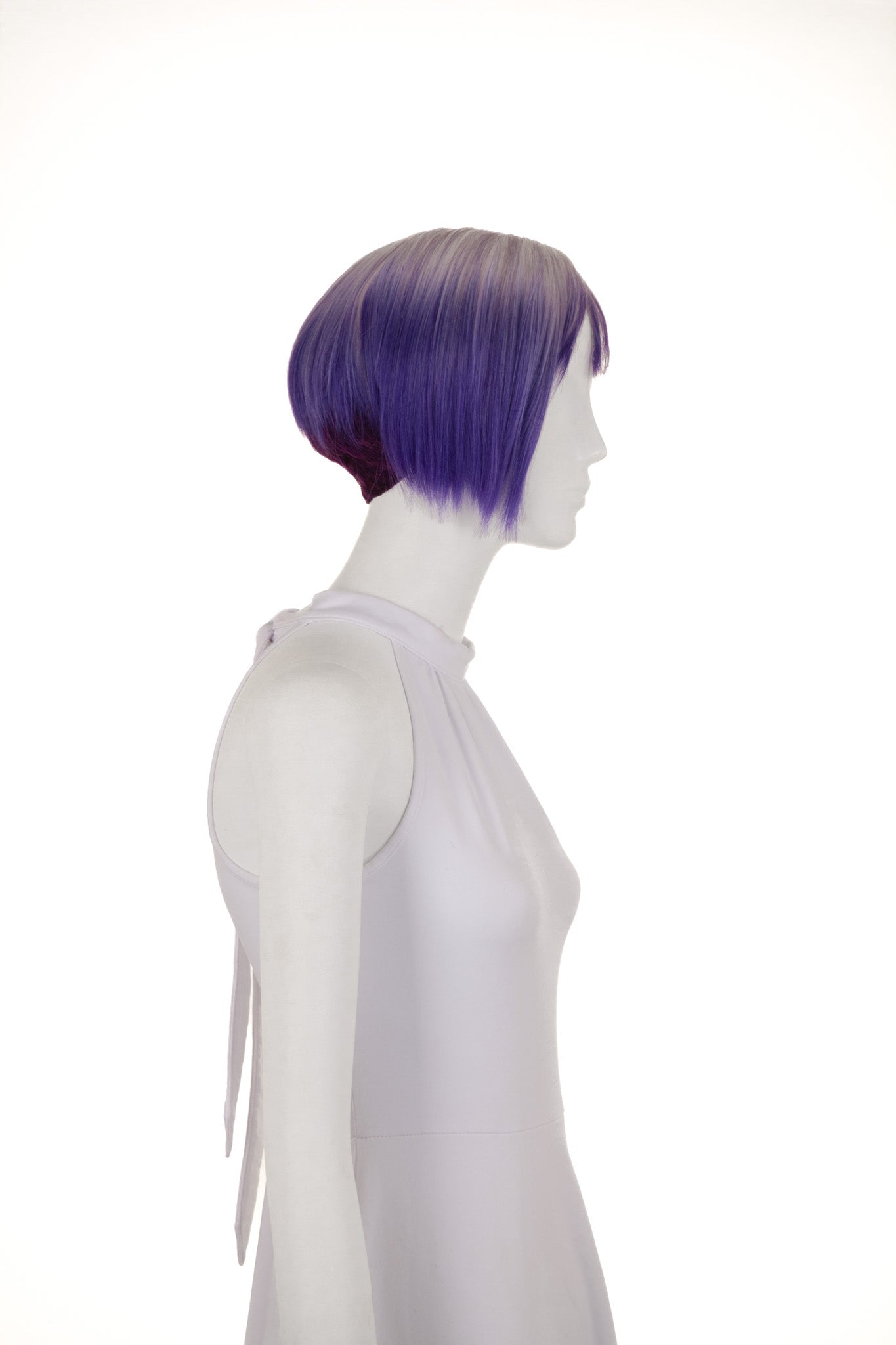 The Sabine Rebel 2 Style features an asymmetrical bob with an undercut. The wig has a gradient coloring of Frost Blonde (CL-054A) transitioning to a lighter purple and ending in our Plum (CL-021). The left side of the wig measures longer at 10” and shortening in a bob style as it goes towards the back of the head. The right side of the wig measures approximately 6” at its shortest and 7” at its longest. The fibers in the back of the wig measure 4” at the shortest and 8” at longest points.