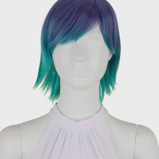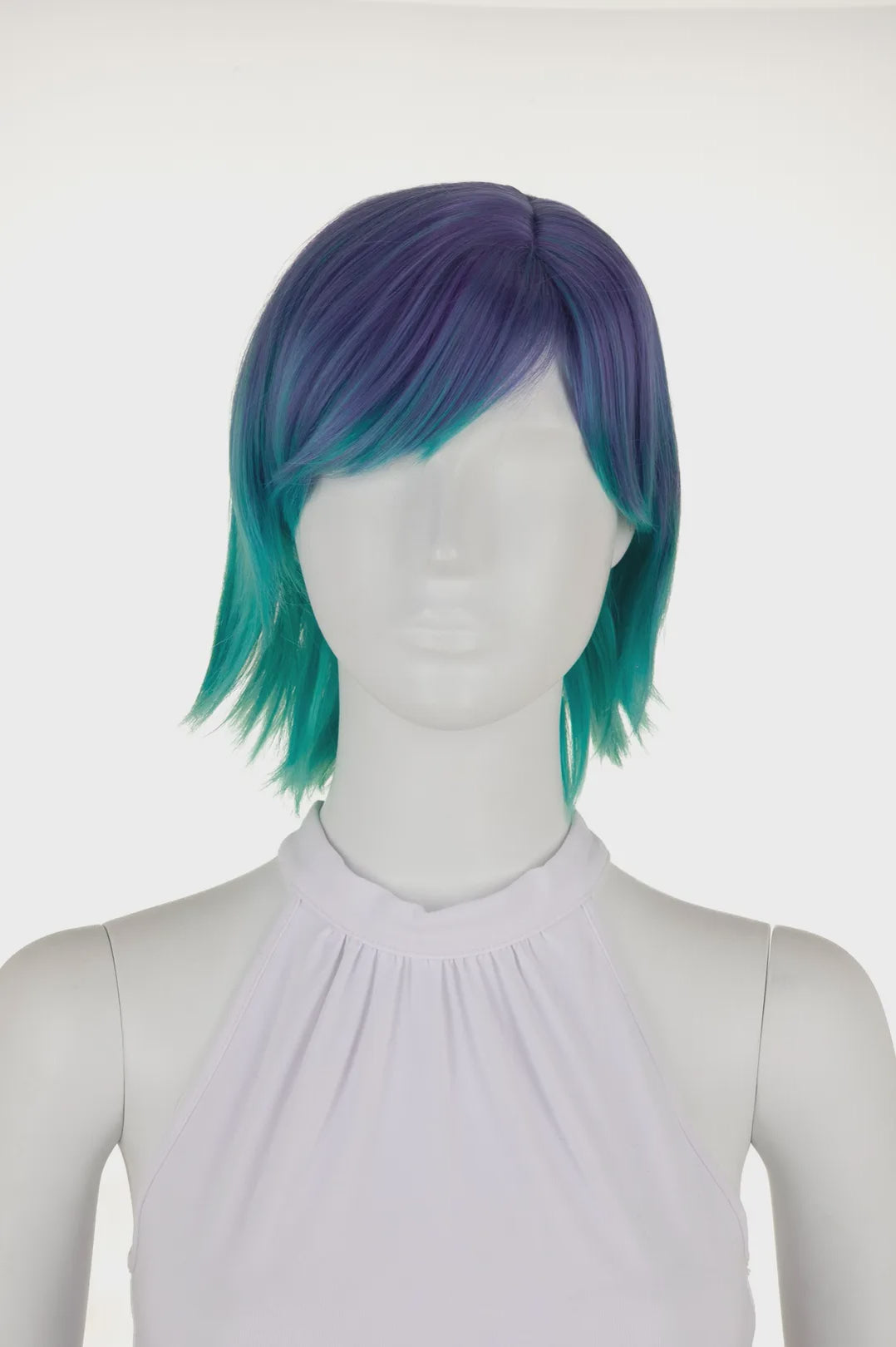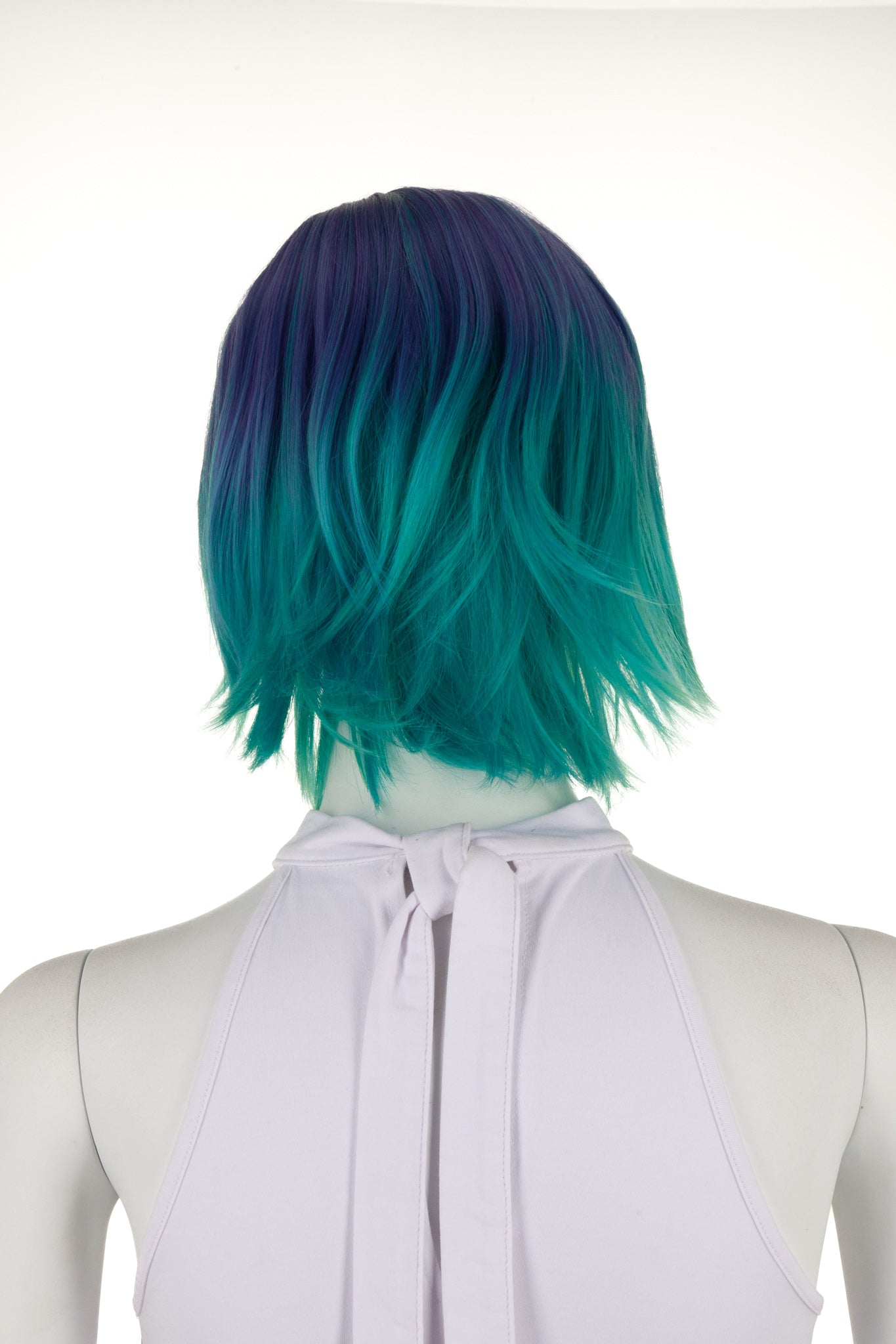 The Sabine Rebel 2 Style features an asymmetrical bob with an undercut. The wig has a gradient coloring of Frost Blonde (CL-054A) transitioning to a lighter purple and ending in our Plum (CL-021). The left side of the wig measures longer at 10” and shortening in a bob style as it goes towards the back of the head. The right side of the wig measures approximately 6” at its shortest and 7” at its longest. The fibers in the back of the wig measure 4” at the shortest and 8” at longest points.