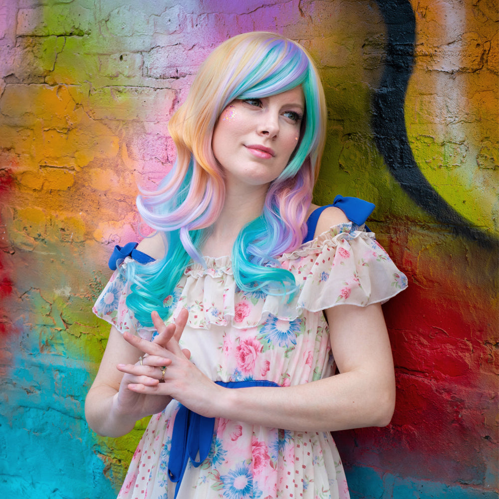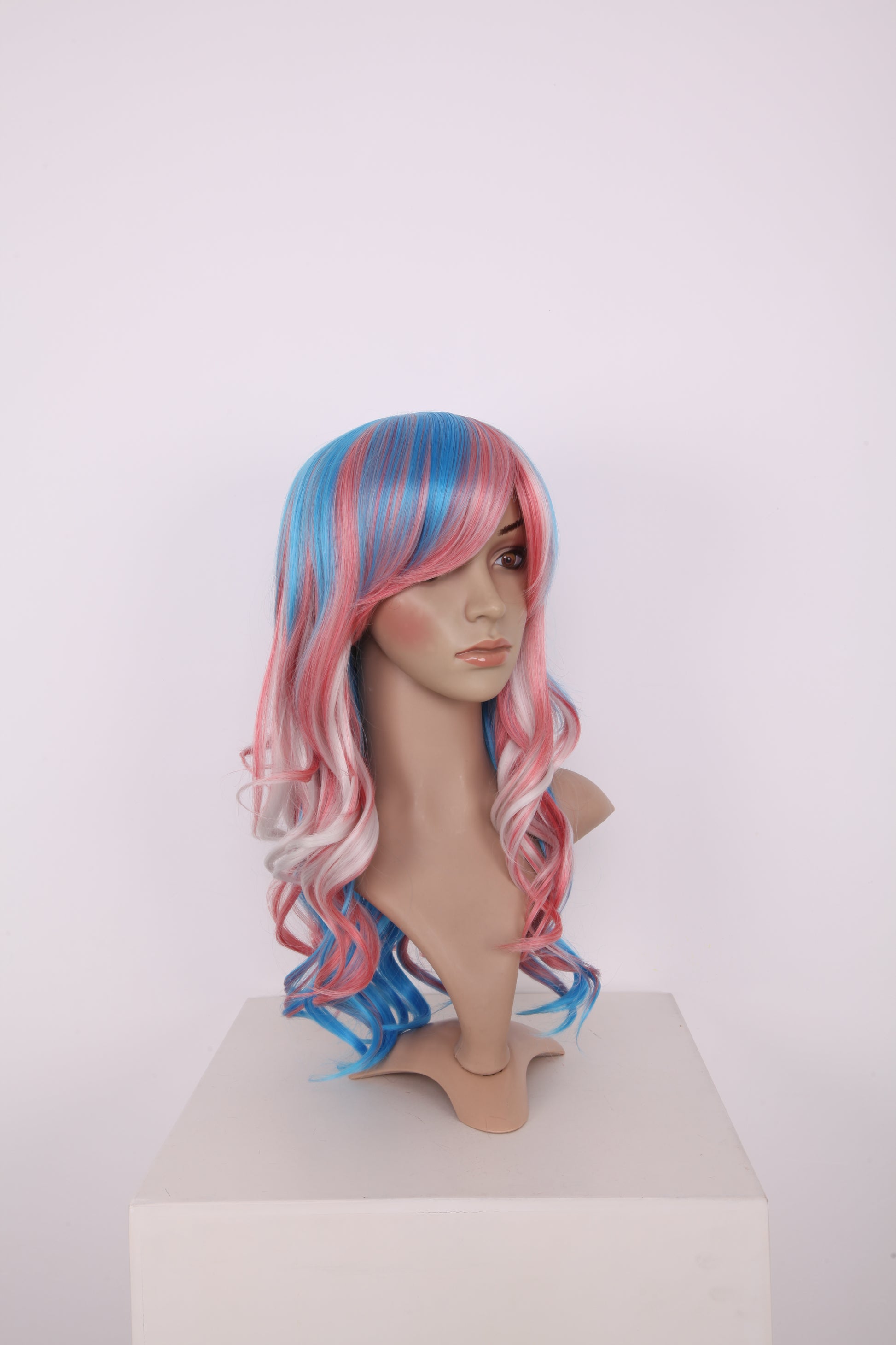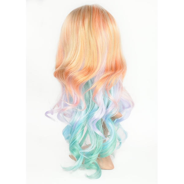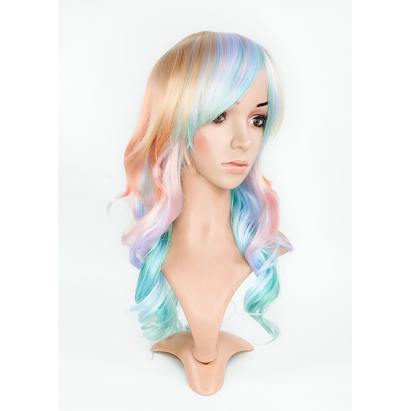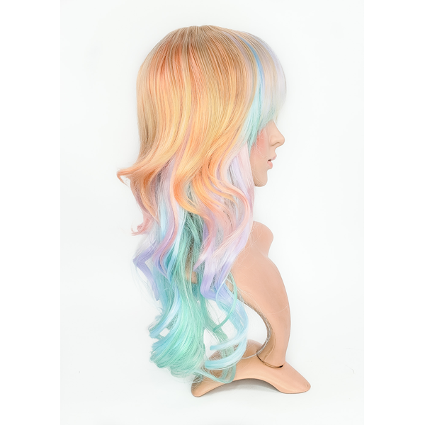 Based on our Ferrari style, this pastel rainbow is perfect for everyday wear or your next Pride event! Halsted has medium-length wavy wig that measures slightly less than 23" (58.5 cm). It has a 1" (2.5 cm) skin top at the crown and long bangs. This wig is thick enough for low ponytails or buns, but is not suitable for a high up-do without re-wefting. Brush the curls for a softer, fluffier look!