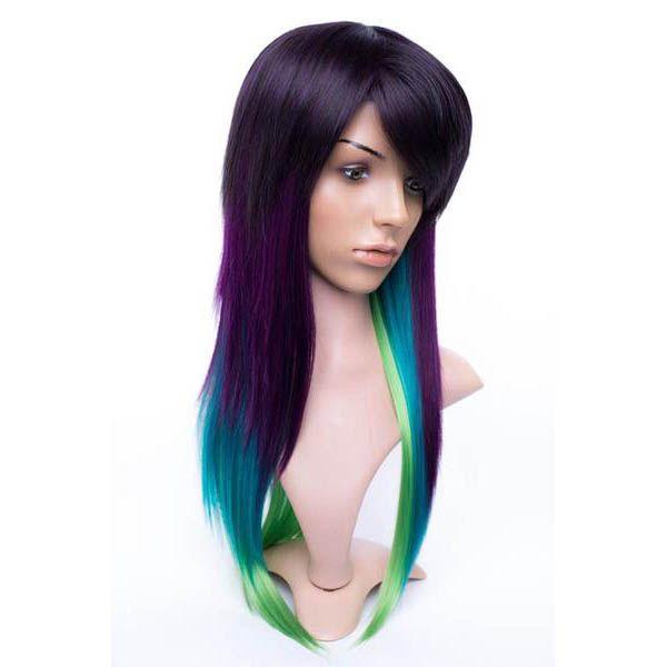 A long, layered, multi-colored wig inspired by the colors of the Northern Lights. From crown to the end of the wig in back is 25" (63.5 cm) and the bangs have a feathered cut. The skin cap on this wig is 1" (2.5 cm) and is located at the crown of the head.