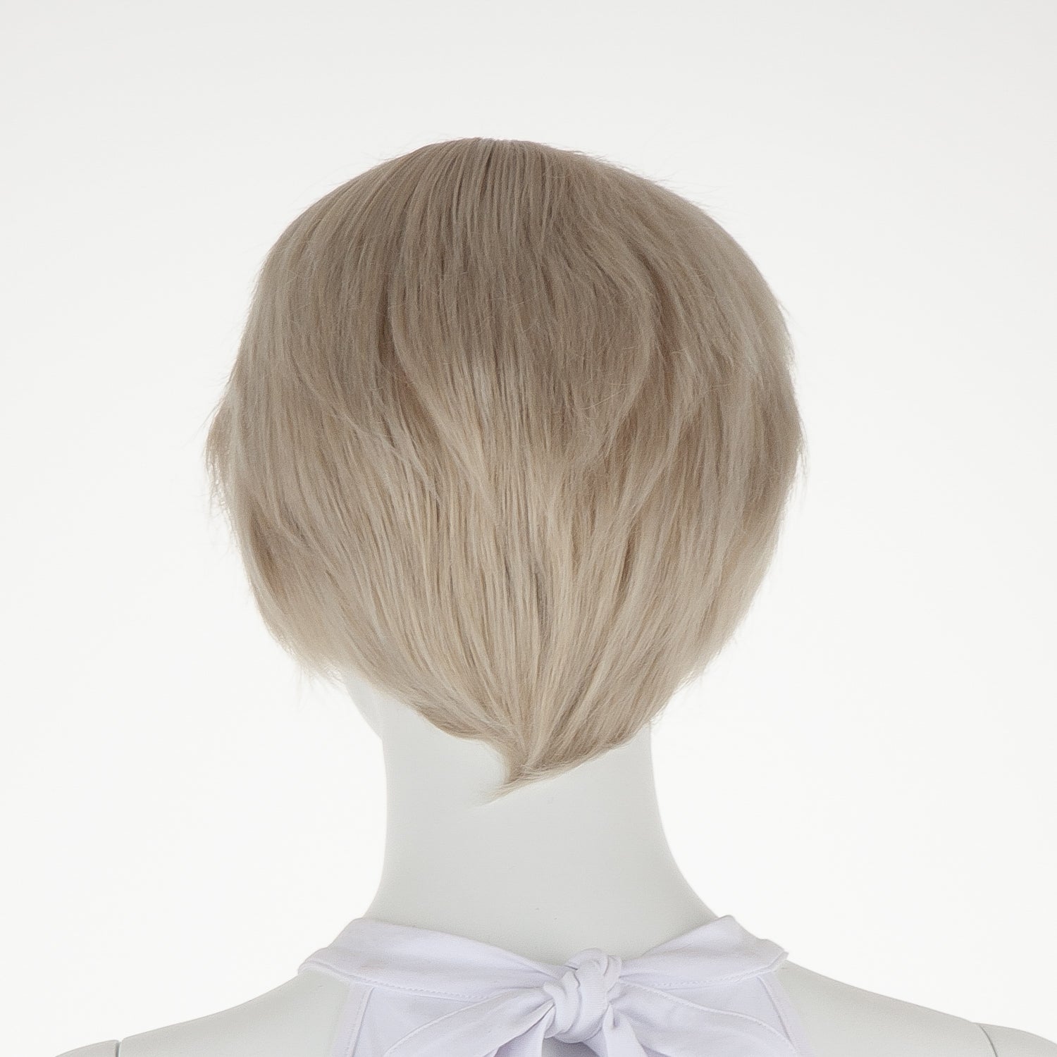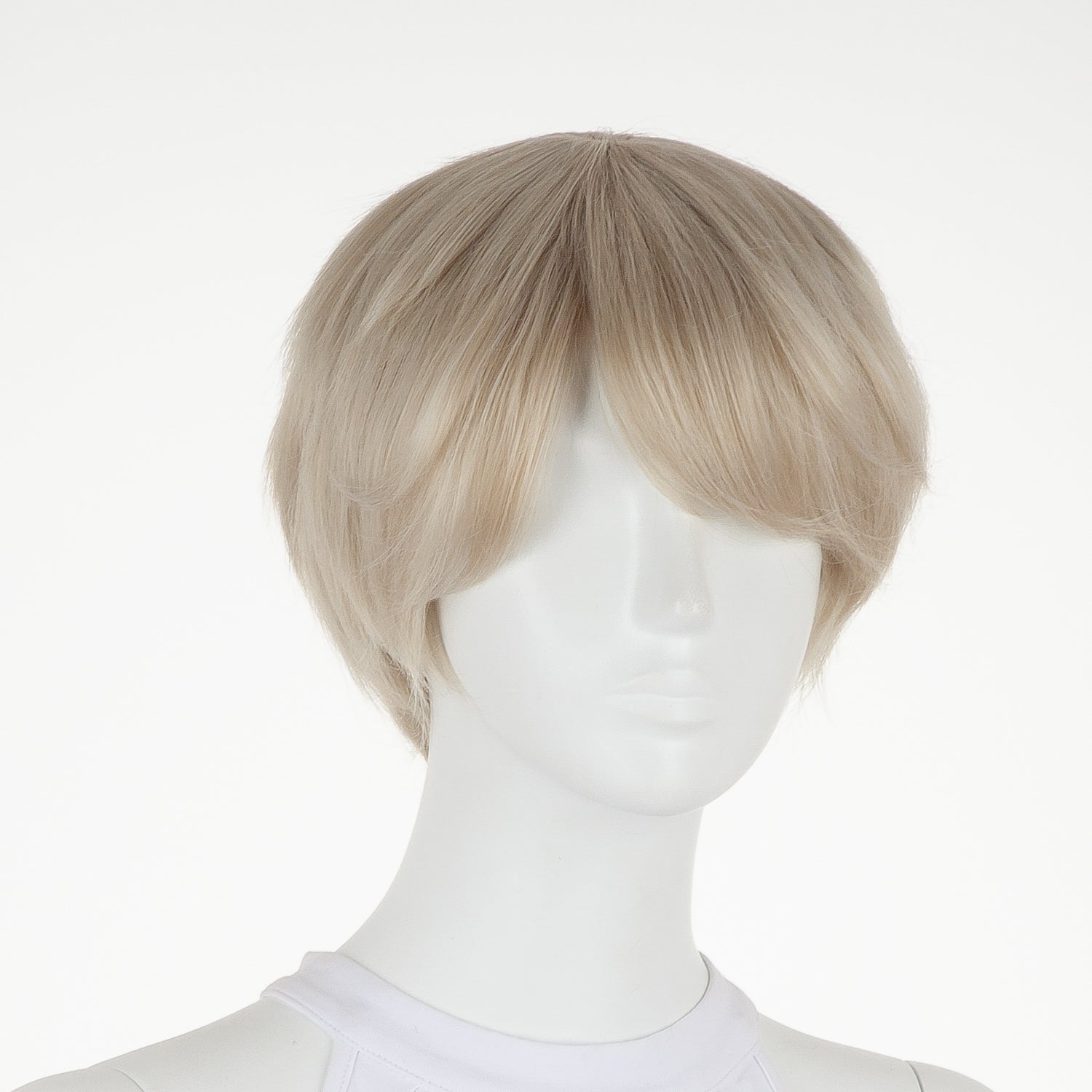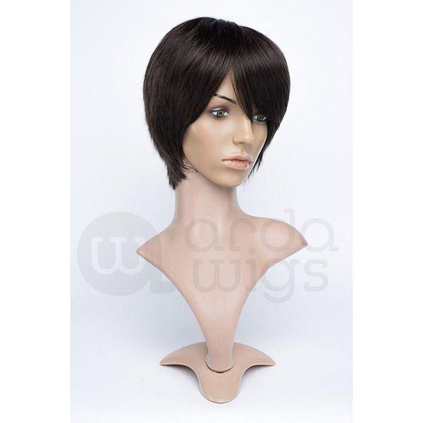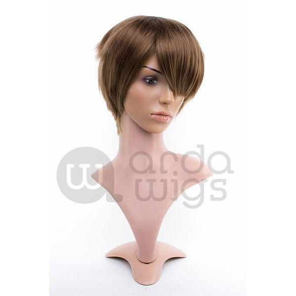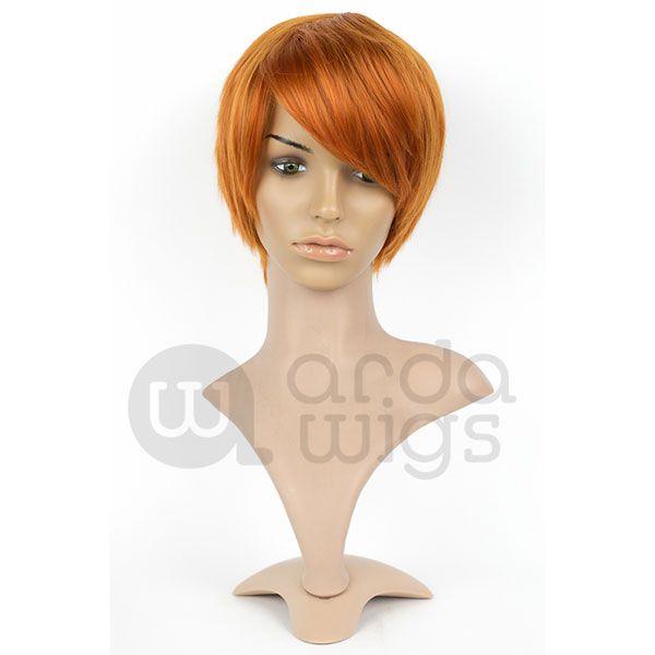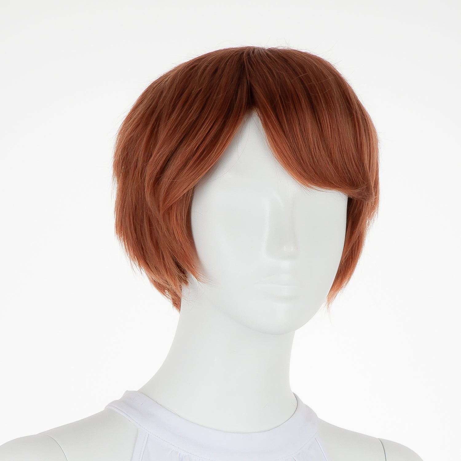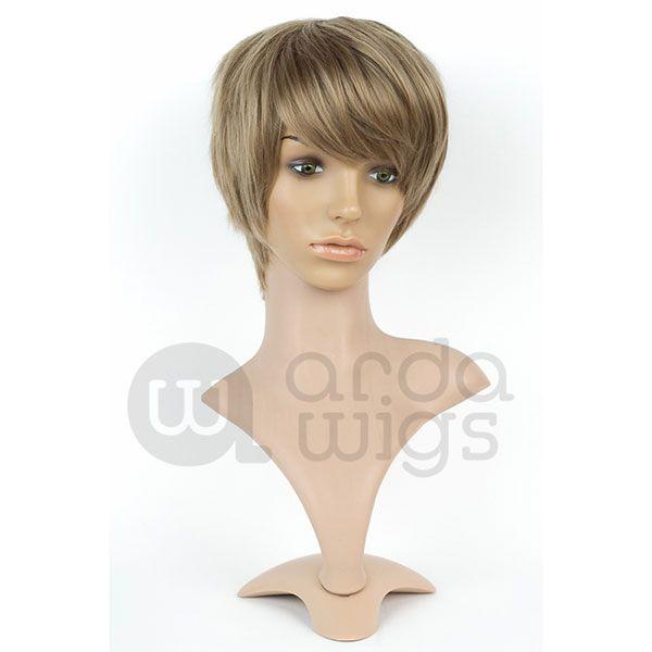 A short, scruffy wig with a small 1" (2.5 cm) skin top at the crown. The fibers are straight and do not flip out like a Hansel, but they are of a similar length. Shorter in the back, with long bangs that hit the bridge of the nose on a person's head.